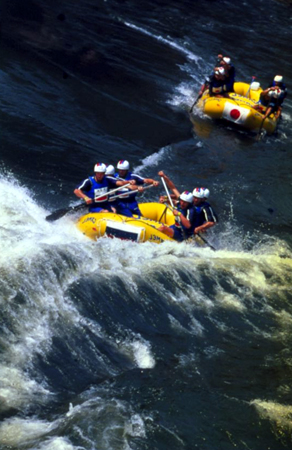 В бурной воде рафт кидает как щепку, и только интенсивные усилия всего экипажа позволяют сохранять судно на киле и выбранной траектории.