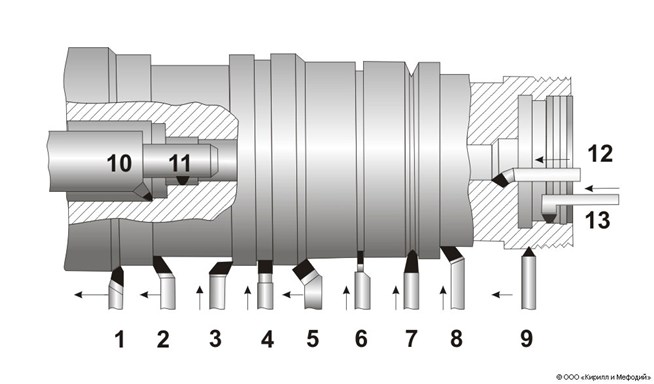 Токарные резцы: 1 — проходной прямой правый; 2 — проходной упорный правый; 3 — подрезной левый; 4 — подрезной; 5 — проходной отогнутый правый; 6 — отрезной; 7 — фасонный; 8 — подрезной правый; 9 — резьбовой (для наружной резьбы); 10 — расточный упорный (в борштанге); 11 — расточный (в борштанге); 12 — расточный; 13 — расточный для внутренней резьбы.