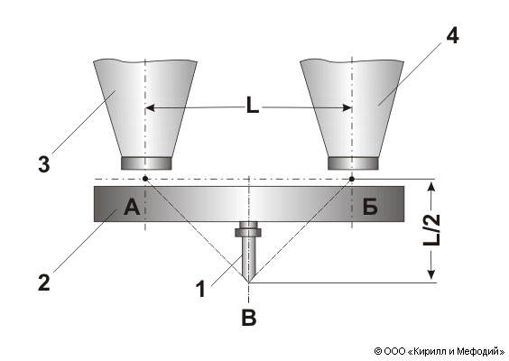 Схема подвижной системы стереофонического рекордера: 1 — сапфировый резец; 2 — поперечная балка (при возбуждении правой части подвижной системы колебания резца происходят относительно точки А, а при возбуждении левой — относительно точки Б); 3 и 4 — левая и правая части подвижной системы, L — расстояние между ними; В — острие резца.