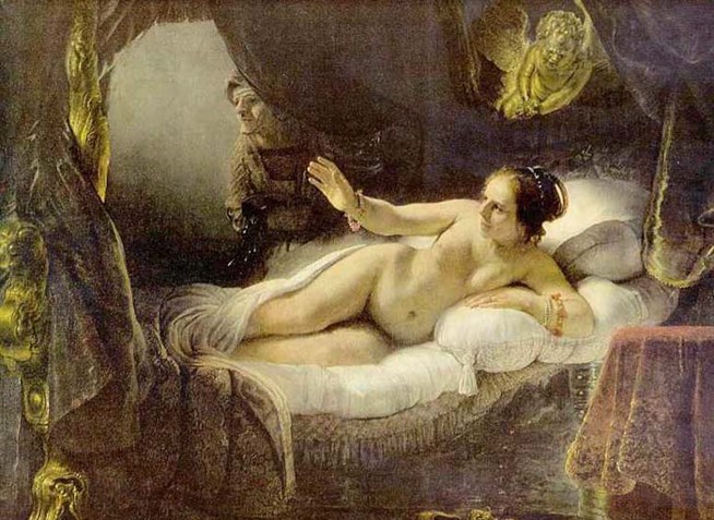 Рембрандт. Даная. 1636-1647 годы. Холст. Эрмитаж, Петербург. В 1640-е годы Рембрандт, перерабатывая некоторые свои картины, созданные ранее, переписал и «Данаю» (1636), стремясь передать прежде всего ее чувства. Достичь этого художнику удалось благодаря изменению выражения лица героини, ставшему более эмоциональным, и новому жесту правой руки, который удивительно точно и проникновенно передает ее чувства: призыв, ожидание и волнение. Новая Даная в мягком сиянии света (вместо первоначального золотого дождя) прекрасна прежде всего искренностью своих чувств. Колорит картины, выдержанный в золотистых тонах (в отличие от предыдущего варианта, в котором преобладали холодные тона), и игра светотеней усиливает это впечатление. В конце 1985 картина (особенно ее центральная часть) была повреждена психически больным человеком, который выплеснул на нее концентрированный раствор серной кислоты и пробил холст двумя ножевыми ударами (12 и 2, 5 см на фигуре Данаи). Благодаря реставрации, проведенной лучшими мастерами Эрмитажа, удалось сохранить более 60 процентов живописи великого мастера.