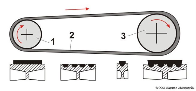 Схема ременной передачи и сечения ремней: а — плоскоременной; б — клиноременной; в — круглоременной; г — поликлиновой; 1 и 3 — ведущий и ведомый шкивы; 2 — ремень.