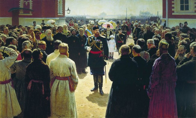 И.Е. Репин. Прием волостных старшин императором Александром III во дворе Петровского дворца в Москве. 1885-1886 годы. Холст, масло. Третьяковская галерея, Москва. На картине изображен Александр III с семьей вскоре после коронации 5 мая 1883 года. На втором плане изображены императрица Мария Федоровна и царские дети Николай, Георгий, Ксения.