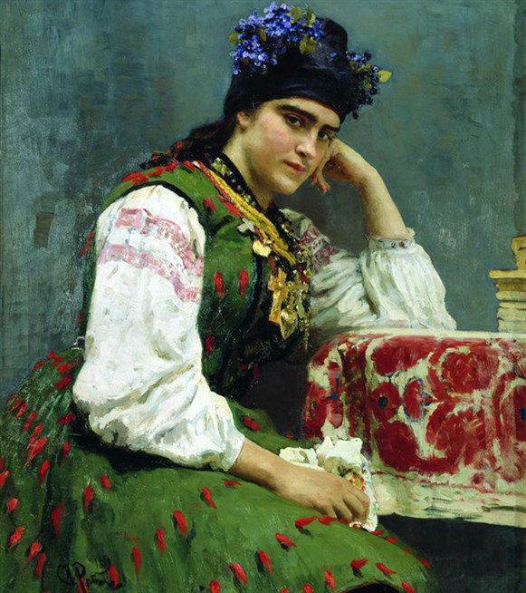 И.Е. Репин. Портрет С.М. Драгомировой. 1889 год. Холст, масло. Русский музей, Петербург. Софья Михайловна Драгомирова (1871-1953) — дочь генерала М.И. Драгомирова, командующего войсками Киевского военного округа. Ее портреты в украинском костюме были одновременно выполнены И.Е. Репиным и В.А. Серовым.