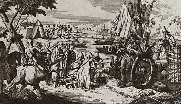 Н. В. Репнин (в центре) принимает капитуляцию турецкой крепости. Старинная гравюра.