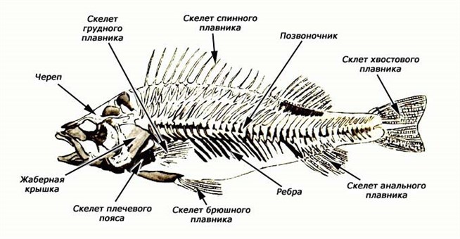 Скелет речного окуня. Позвонок рыб состоит из двояковогнутого костного диска, вверх от которого отходит непарный отросток. Снизу к позвонку прикрепляются ребра. В основании парных плавников развит скелет поясов конечностей.