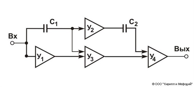 Структурная схема операционного усилителя: Bx — вход операционного усилителя; С — разделительные конденсаторы; У1 — усилитель низкой частоты и постоянного тока; У2 — высокочастотный усилитель с ky ~ 1; Уз — усилитель средней частоты; У4 — выходной широкополосный усилитель; Вых — выход операционного усилителя.