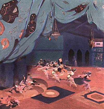 Декорация Л. Бакста к балету «Шехеразада» на музыку одноименной симфонической сюиты Н.А. Римского-Корсакова. Акварель Л. Лелонга.