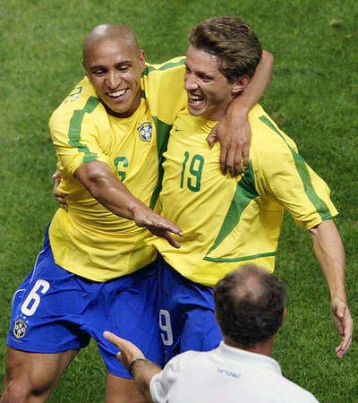 Чемпионат мира 2002 г. в Японии и Южной Корее. Автора гола Роберто Карлоса (номер 6), поздравляют полузащитник Жунинью Пернамбукану и тренер К. А. Паррейра.