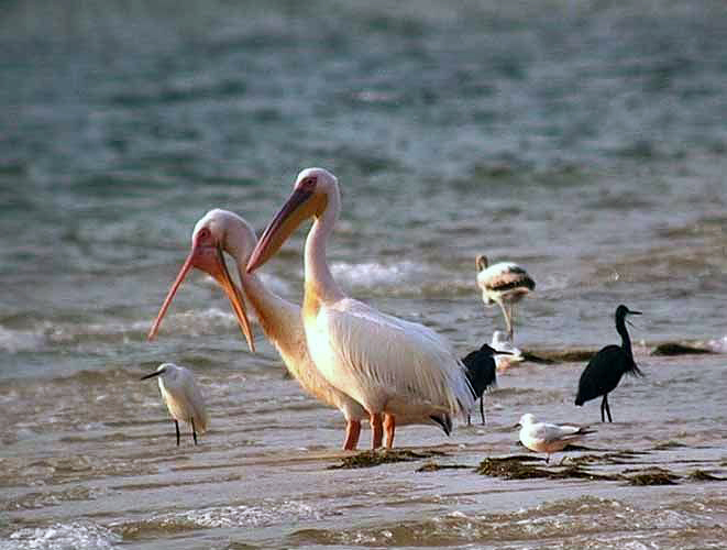Пара розовых пеликанов (Pelecanidae onocrotalus).