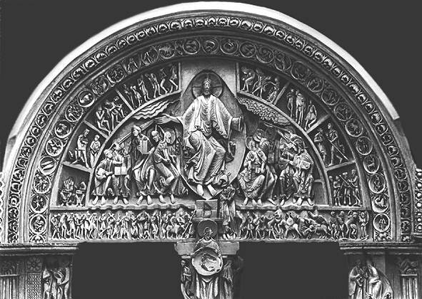 «Пятидесятница». Тимпан церкви Ла Мадлен в Везле. Франция. Около 1130. Романской архитектуре присуще стремление к целостности, строгости и простоте. Фресковые росписи романских храмов сохранились лишь в редких случаях. Особенностью романского стиля стало появление скульптурного декора, в первую очередь, рельефа.