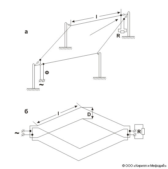 Ромбическая антенна: а — одиночная; б —двойная (вид сверху); l — сторона ромба; Ф — фидер, соединяющий антенну с передатчиком или приемником; R — резистор; D — смещение ромбов. Стрелкой показано направление максимальной интенсивности излучения.