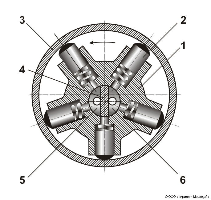 Схема радиально-поршневого роторного насоса: 1 — ротор; 2 — поршень; 3 — барабан (статор); 4 — цапфа; 5 — полость нагнетания; 6 — полость всасывания.