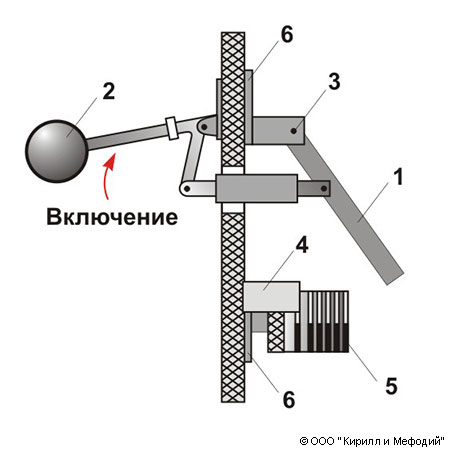 Однополюсный рубильник с дугогасительной камерой: 1 — контактный нож; 2 — рукоятка: 3 — ось; 4 — контактная стойка; 5 — дугогасительная камера; 6 — токоподводы.