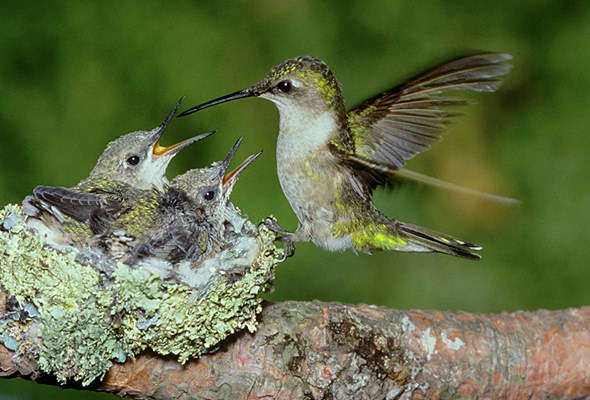 Самка рубиновогорлого колибри с птенцами.