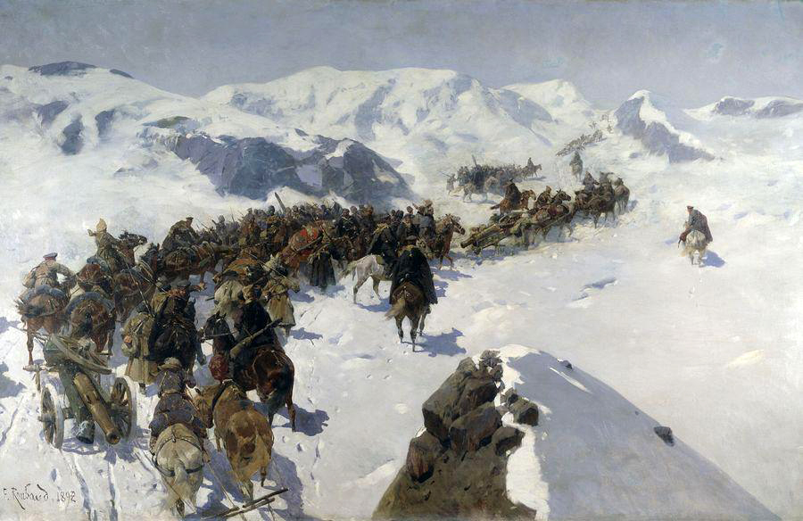 Ф.А. Рубо. Переход князя Аргутинского через Кавказский хребет. 1896 год. Холст, масло. Дагестанский музей изобразительных искусств.