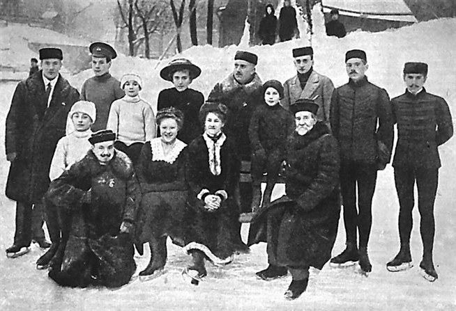 Русские фигуристы на катке Юсупова сада в Петербурге 13 января 1913 (крайний слева в первом ряду Н. А. Панин-Коломенкин)