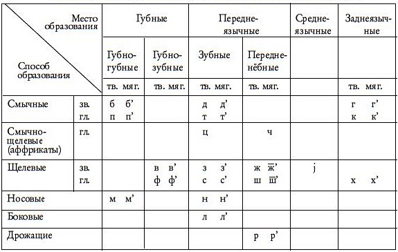 Система согласных фонем русского языка. Из книги Светланы Бурлак «Происхождение языка: факты, исследования, гипотезы», 2011 год.