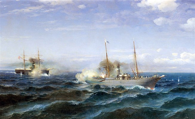 Руфин Гаврилович Судковский (1850-1885). Бой парохода «Веста» с турецким броненосцем «Фетхи-Буленд» 11 июля 1877 года. 1881 год. Центральный-военно-морской музей, Петербург.