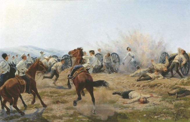 Наркиз Николаевич Бунин (1856-1912). Смерть генерала Келлера на Янзелинском перевале (1904). 1905 год. Холст, масло. Центральный военно-исторический музей артиллерии, инженерных войск и войск связи.