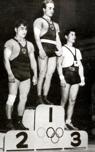 Олимпийский чемпион-тяжелоатлет (1956, Мельбурн) Игорь Рыбак (в центре) и серебряный призер Равиль Хабутдинов (слева).