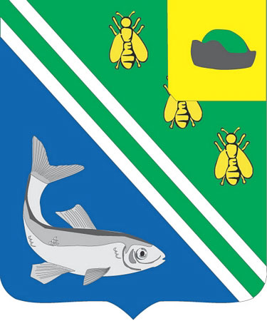 Герб города Рыбное. В рассеченом зеленым и лазоревым щите — серебряно-зелено-серебряная перевязь. В зеленом поле — три золотые пчелы, в лазоревом поле — серебряная рыба. В золотой вольной части — старинная зеленая княжеская шапка, отороченная черным мехом.