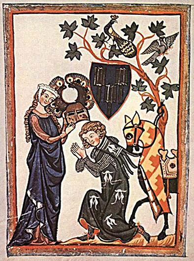 Рыцарь поклоняется Прекрасной даме. Средневековая миниатюра.