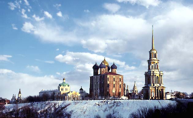 Рязань. Кремль. В центре — Успенский собор (1693-1699), справа — колокольня (1789-1840).