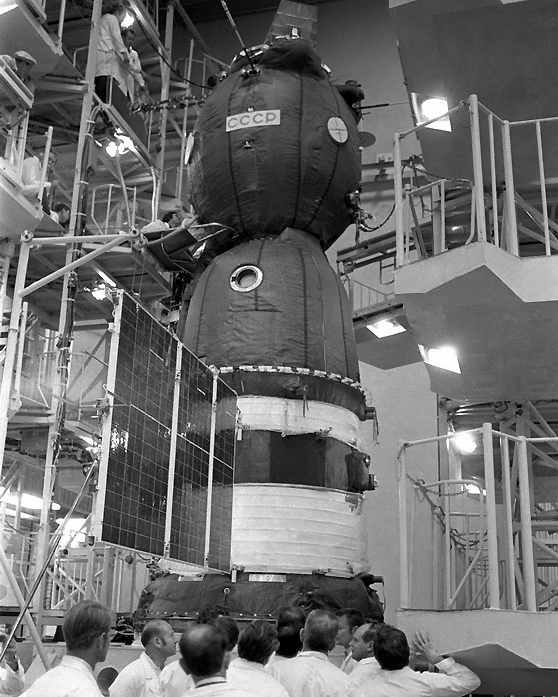 Космодром Байконур. Корабль «Союз-19» в монтажно-испытательном корпусе. 28 апреля 1975 года.