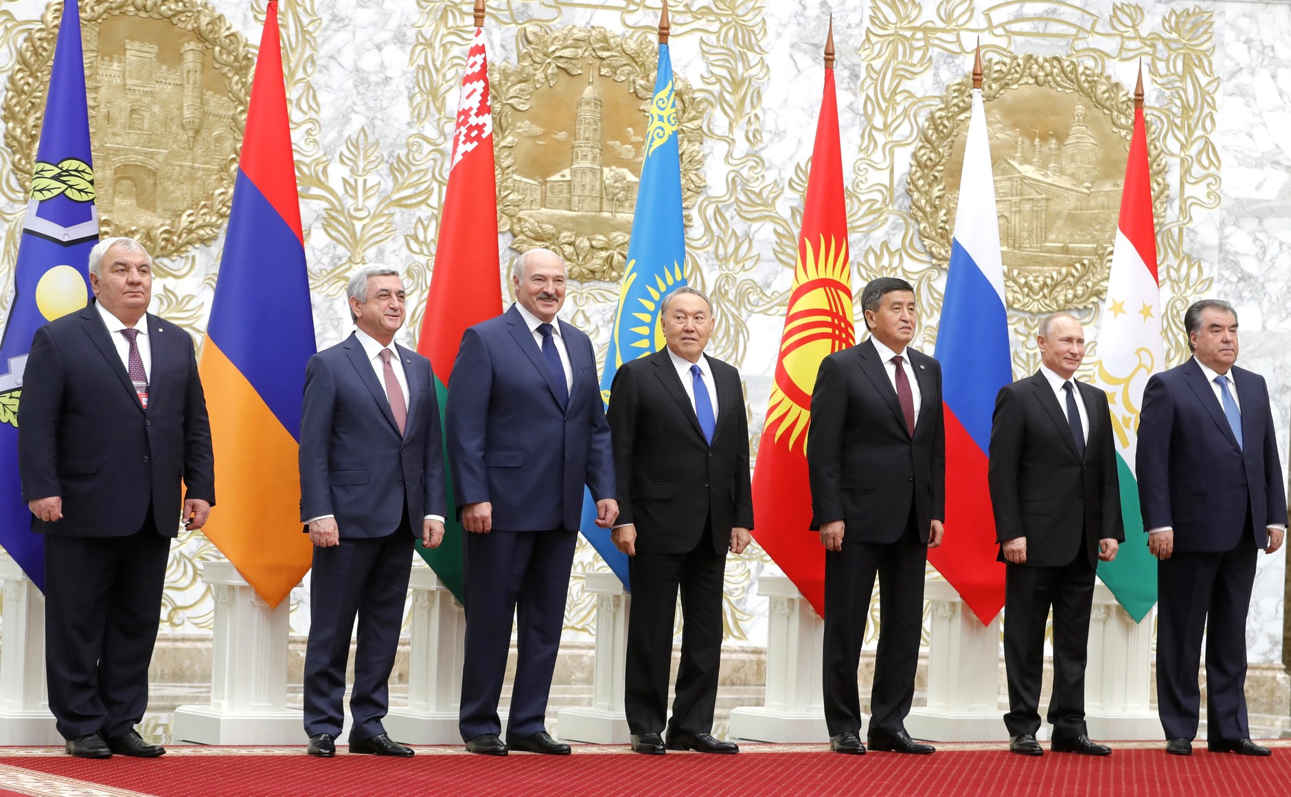 Президент Российской Федерации Владимир Путин, Президент Белоруссии Александр Лукашенко, Президент Армении Серж Саргсян, Президент Казахстана Нурсултан Назарбаев, Президент Киргизии Сооронбай Жээнбеков, Президент Таджикистана Эмомали Рахмон, Генеральный секретарь ОДКБ Юрий Хачатуров приняли участие в заседании Совета коллективной безопасности ОДКБ. Минск 30 ноября 2017 г. Источник: kremlin.ru