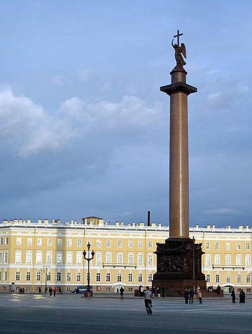 Александровская колонна (или «Александрийский столп») — памятник победы русского народа в Отечественной войне 1812 года — была установлена в 1830-34 (архитектор А. А. Монферран) и названа в честь императора Александра I. Памятник представляет собой монолитную колонну высотой свыше 25, 5 м из красного гранита, установленную на постамент, украшенный бронзовыми барельефами аллегорического содержания. Венчает колонну бронзовая фигура ангела, его лицу приданы черты Александра I (скульптор Б. И. Орловский). Ангел попирает крестом змею — символ победы добра над злом.