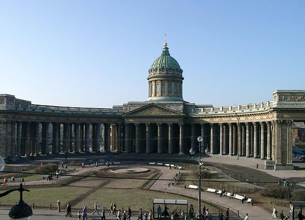 Санкт-Петербург. Казанский собор. Построен для перенесения в него древней иконы Казанской богоматери, по ее имени и назван. Здание собора является монументальным памятником архитектуры русского классицизма (архитектор А. Н. Воронихин). 1801-11. Грандиозная полукруглая колоннада из 96 поставленных в четыре ряда коринфских колонн с шестиколонным портиком в центре примыкает к боковому (северному) входу собора и обращена к Невскому проспекту.