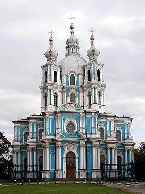 Санкт-Петербург. Смольный собор расположен в центре Смольного монастыря. Построен в 1748-64 гг. архитектором Растрелли, а интерьер создал В. П. Стасов в 1832-35 гг.