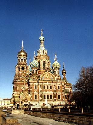 Санкт-Петербург. Церковь Спаса на Крови. Другое название — храм Воскресения Христова. Построен на месте, где 1 марта 1881 был смертельно ранен Александр II. Архитекторы И. В. Макаров, А. А. Парланд. Здание в духе русского узорочья 16-17 вв. по образцу московского храма Василия Блаженного отличается сложным живописным силуэтом, богатым многоцветным декоративным убранством. Особенно замечателен крупнейший по масштабам ансамбль мозаик на фасадах и в интерьере (В. М. Васнецов, М. В. Нестеров, М. А. Врубель, А. П. Рябушкин и др.).