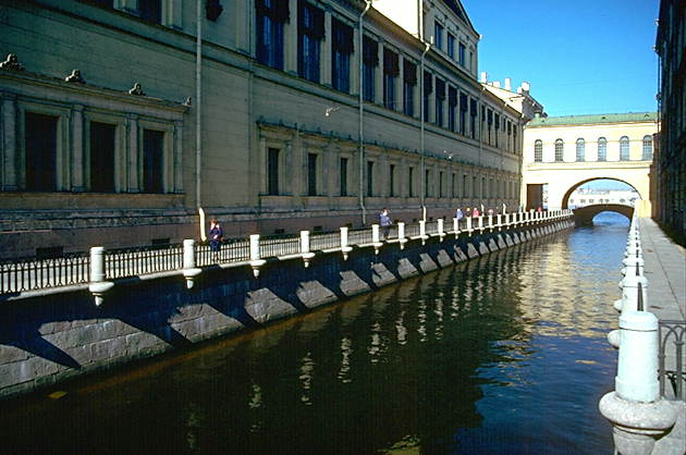 Санкт-Петербург. Зимняя канавка. Канал был прорыт в 1718-19 гг. от реки Большая Нева до реки Мойка между современными зданиями Старого Эрмитажа и Эрмитажного театра, соединенными крытой галереей. Первоначально канал назывался Зимнедомским, или Зимнедворцовым (по соседнему Зимнему дворцу Петра I).