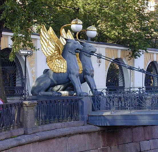 Банковский мостик с фигурами крылатых львов (скульптор П. П. Соколов) через канал Грибоедова (бывший Екатерининский).