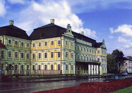 Меншиковский дворец. Расположен на Университетской набережной Васильевского острова. Построен в 1710-27 для А. Д. Меншикова. Архитекторы Дж. М. Фонтана, Г. И. Шедель, при участии Д. Трезини, Б. К. Растрелли, Г. И. Маттарнови и Ж. Б. Лебло.