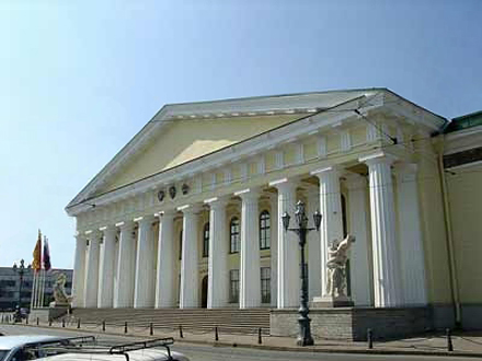 Санкт-Петербург. Горный институт. Здание было построено в стиле ампир в 1806-1811 гг. по проекту архитектора А. Н. Воронихина, скульптурные группы у колоннады парадного фасада были созданы скульптором С. С. Пименовым, барельефы на мифологические сюжеты — скульптором В. И. Демут-Малиновским, отделка Колонного зала и Зала кариатид, а также строительство флигелей (1820-1829) — архитектором А. И. Постниковым.