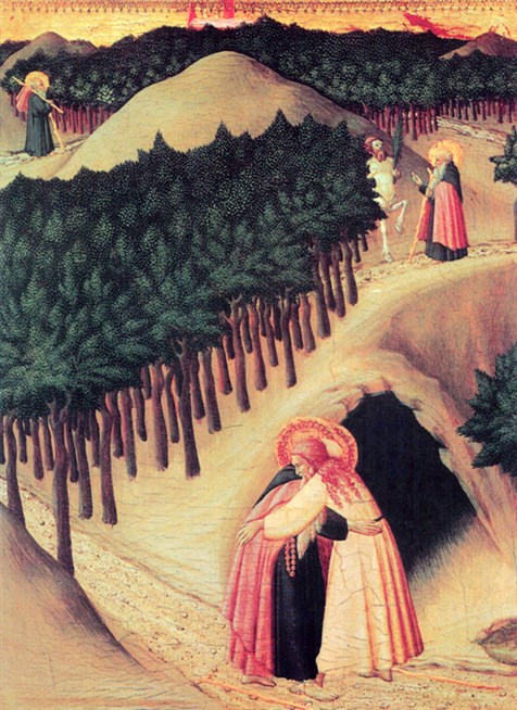 Стефано Сассета. Встреча святого Антония со святым Павлом. 1440 год. Дерево, темпера. Национальная галерея, Вашингтон. Сюжет картины связан с житием Святого Антония Великого (251-356), отшельника Египетской пустыни. Когда святому Антонию исполнилось 90 лет, он отправился искать отшельника святого Павла, которому уже было 113 лет. Дорогу святому Антонию указал кентавр.
