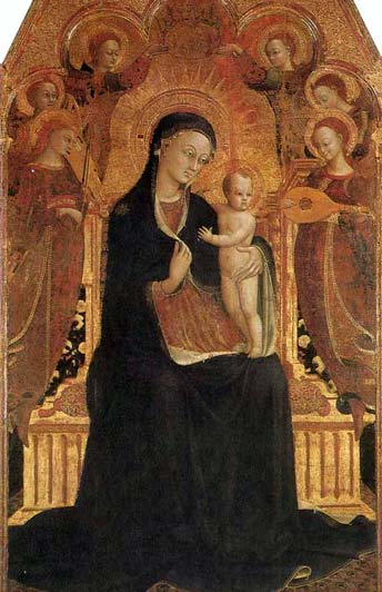 Сассетта. Мария с младенцем Иисусом, окруженная шестью ангелами. Вторая четверть 15 века. Дерево. Лувр, Париж.