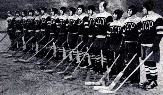 В 1954 году советская сборная дебютировала на чемпионате мира в Стокгольме. В решающем матче советские хоккеисты, ведомые своим капитаном Всеволодом Бобровым, встречались с признанным лидером в хоккее — канадской сборной. Итог встречи сенсационный — победа сборной СССР со счетом 7:2. На снимке: сборная СССР. Источник: worldhockeyclassic.ru