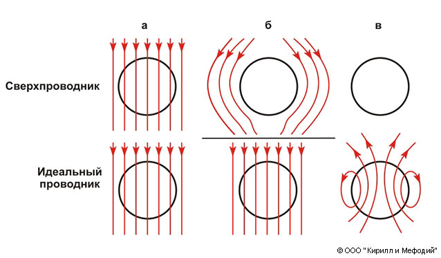 Распределение магнитного поля около сверхпроводящего шара и около шара с исчезающим сопротивлением (идеальный проводник): а) Т > Тк; б) Т