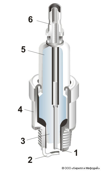 Свеча зажигания: 1 - центральный электрод; 2 - боковой электрод; 3 - юбка; 4 - стальной корпус; 5 - изолятор; 6 - контактная гайка.