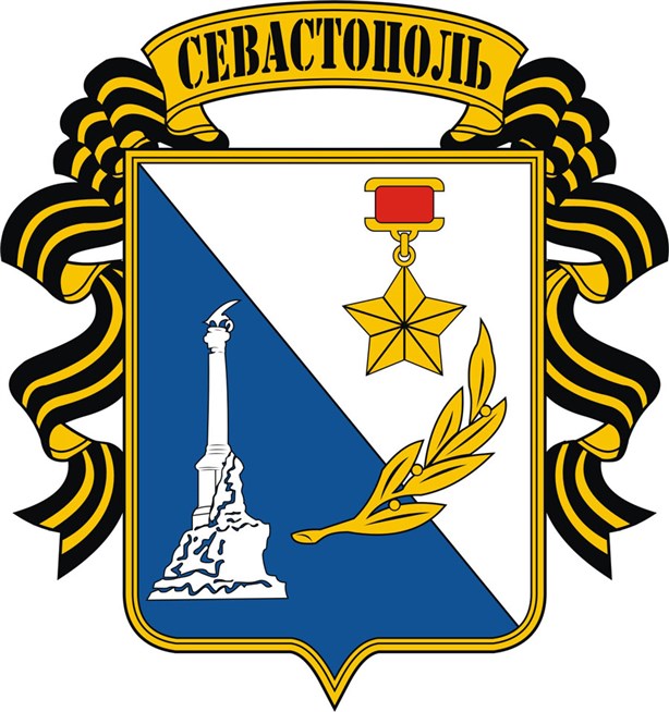 Описание: Герб города представляет собой скошенный справа геральдический щит французской формы с отношением ширины к высоте как 8 к 9. Щит имеет внешнюю кайму золотистого цвета. В правой верхней стороне герба на серебряном (светло-сером) поле изображена медаль «Золотая звезда». На левой нижней стороне герба на лазоревом (голубом) поле изображен силуэт памятника Затопленным кораблям серебряного (светло-серого) цвета (вид с берега бухты). Композиционно объединяет два поля лавровая ветвь золотистого цвета, символизирующая славу защитников Севастополя.
