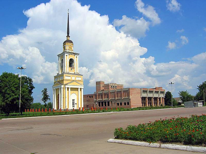Севск. Главная площадь города — площадь Октябрьской революции. Доминирующее сооружение площади — колокольня Успенского собора. Начало 19 века. Сам собор не сохранился. На колокольне находятся городские куранты. Фото А. Карпова.
