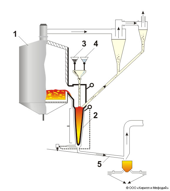Сегрегационная камера с вспомогательным оборудованием: 1 — печь кипящего слоя; 2 — реактор; 3 и 4 — питатели (для угля и каменной соли); 5 — желоб.