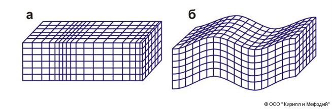 Блок-диаграмма колебаний в продольной (а) и поперечной (б) сейсмических волнах.