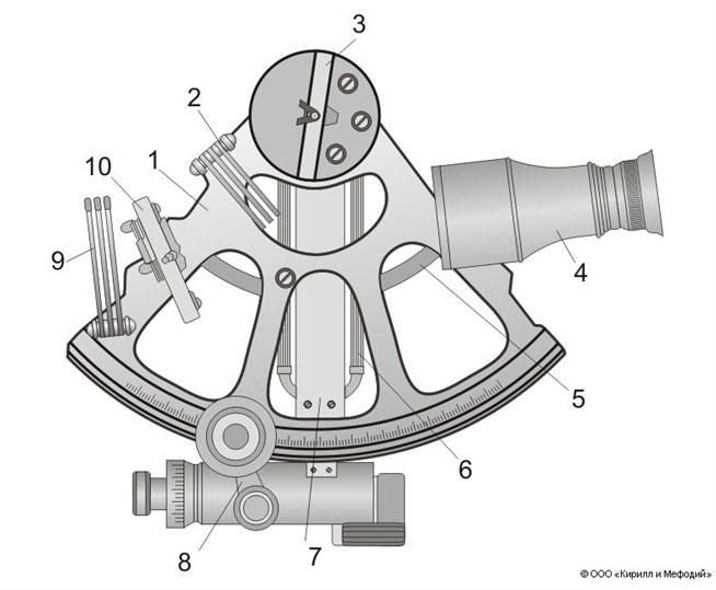 Секстант: 1 — рама; 2 — светофильтры большого зеркала; 3 — большое зеркало; 4 — зрительная труба; 5 — планка; 6 — ручка; 7 — алидада с отсчетно-стопорным устройством; 8 — осветитель; 9 — светофильтры малого зеркала; 10 — малое зеркало.