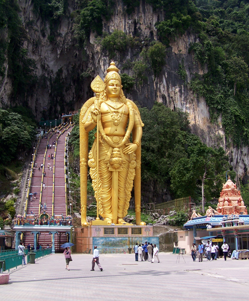Селангор. Статуя божества Муругана близ индуистского пещерного храма Бату. Высота покрытой золотой краской статуи составляет 42, 7 метров, на ее изготовление потребовалось 1, 5 тысячи куб.м. бетона, 250 тонн стальных балок и более 300 литров золотой краски.