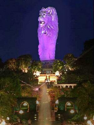 Сентоза. Подсвеченная башня Мерлайона. Высота 37 м.