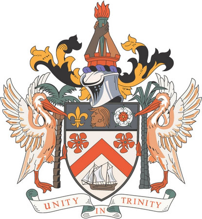 Герб ассоциации Сен-Китс, Невис, Ангилья (1967-1983). Современный государственный герб Сент-Кристофера и Невиса почти не отличается от герба ассоциации Сент-Кристофер, Невис, Ангилья. С достижением независимости в 1983 году в него были внесены лишь два изменения: двухмачтовую шхуну сменил одномачтовый лихтер, а прежний девиз «Единство в троице» был заменен «Страна выше себя». Центральным изображением гербового щита является парусник. Голова индейца-кариба олицетворяет доколониальное прошлое, а французская геральдическая лилия и английская геральдическая роза символизируют борьбу за острова между Францией и Великобританией. Тропическую растительность островов представляют на гербе два цветка местного дерева пуансианы, считающейся национальным символом. Животный мир островов олицетворяет поддерживающие щит два бурых пеликана. Земледелие представляют изображенные по бокам щита кокосовая пальма и сахарный тростник. Над щитом традиционный для британской геральдики рыцарский шлем с венком и наметом. Шлем увенчан башенной короной. Над короной три руки — негра, белого и мулата — держат факел борьбы за свободу.